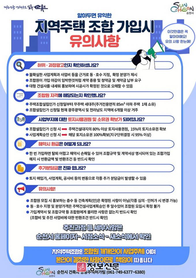 ![]() 순천시, 지역주택조합 가입 시 시민 피해 예방을 위한 주의 당부 |