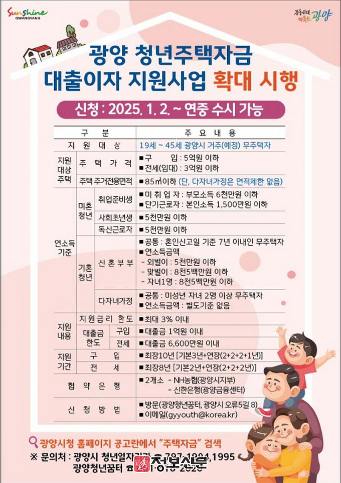 도내에서 유일하게 3년 연속으로 인구가 증가한 광양시는 외지 청년 인구의 유입을 유도하고 아이 낳기 좋은 도시 조성에 박차를 가하기 위해 올해부터 ‘광양청년 주택자금 대출이자 지원사업’ ▲대상자 연령을 기존 19~39세에서 19~45세로 확대하고 ▲다자녀가정(미성년 자녀 2명 이상)의 경우 주거전용면적 제한을 전격적으로 폐지한다.