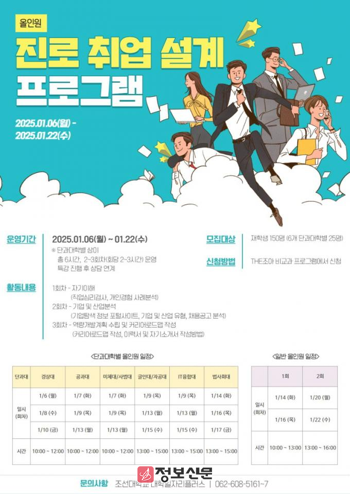 김재홍 조선대 대학일자리플러스센터장은 “학생들이 전공과 희망 직군에 맞춰 최신 채용정보를 습득하고 전략적으로 취업 준비를 할 수 있도록 대학일자리플러스센터가 앞장서겠다”고 말했다.