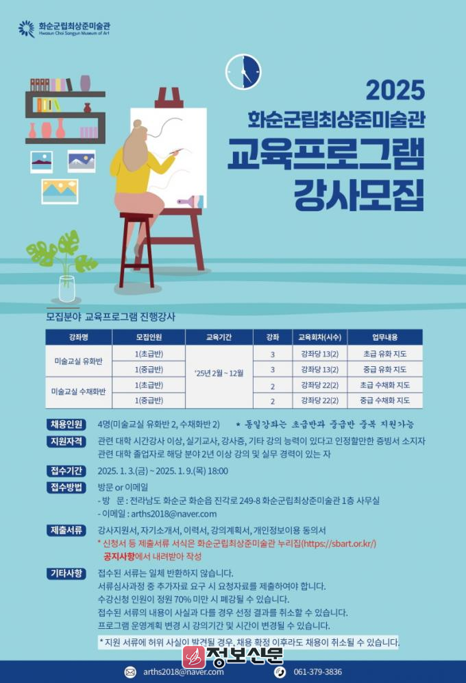 ![]() 화순군립최상준미술관, 2025년『미술교실』강사 모집 |
