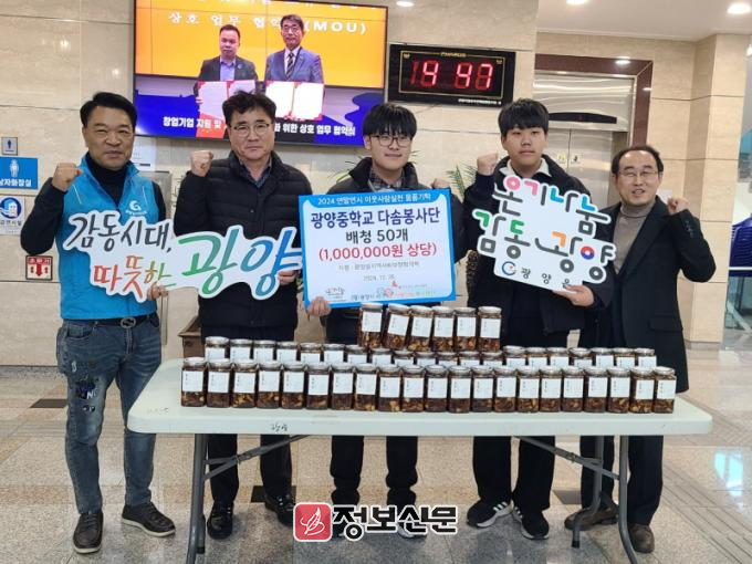 허형채 민간위원장은 “광양중학교 학생들의 지역 어르신을 향한 따뜻한 마음이 감동적이고 학생 여러분과 이웃을 위한 나눔의 기회를 가져 뜻깊다. 건강식품은 대상 가구에 잘 전달해 이들의 건강한 겨울나기를 지원하겠다”고 전했다.