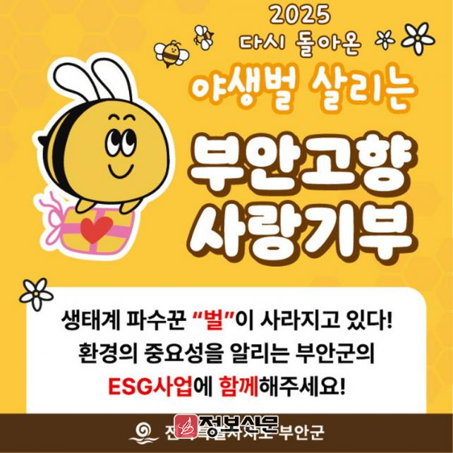 ‘야생벌 붕붕이를 지켜주세요!’ 사업은 부안군 제1호이자 전북특별자치도 지자체 중 처음 시작한 지정기부 사업으로 생태계 유지의 핵심 역할을 하는 야생벌의 서식지를 보존하고 생물 다양성을 증진시키기 위해 추진된 지정기부 프로젝트다. 기부금은 비호텔 설치, 밀원 식물 확대, 환경 교육 프로그램 운영 등 실질적인 환경 보호 활동에 사용될 계획이다.