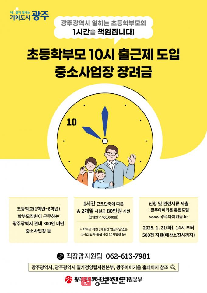 광주광역시(시장 강기정)는 ‘지각장려금’으로 불리며 출·퇴근 시간을 1시간 조정할 수 있는 ‘초등학부모 10시 출근제’에 참여할 사업장을 모집한다.