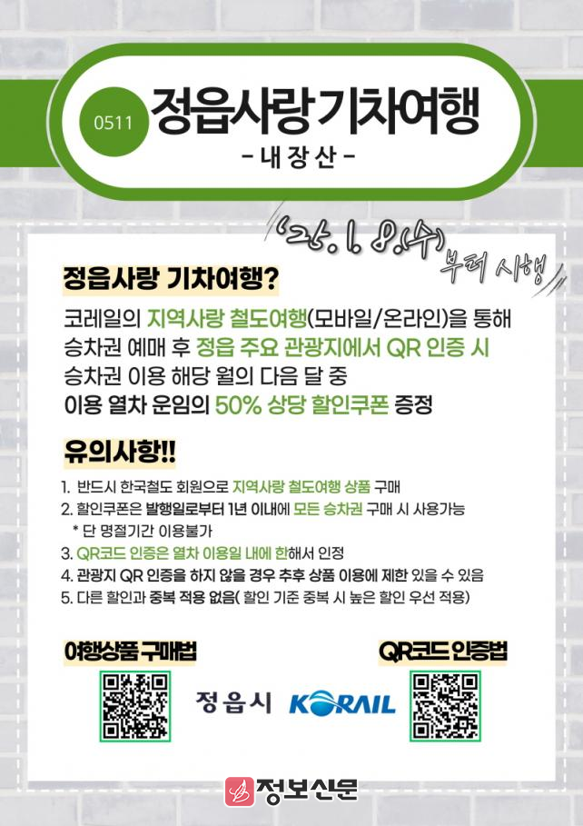 ![]() 정읍시, 이제부터 반값 기차 타고 정읍 여행 즐겨요! |