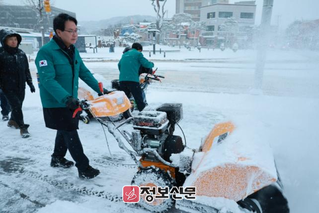 9대의 덤프차량과 마을 안길은 제설봉사자 트랙터 241대, 읍·면 관용차 14를 동원해 신속한 제설작업을 추진하고 있다.