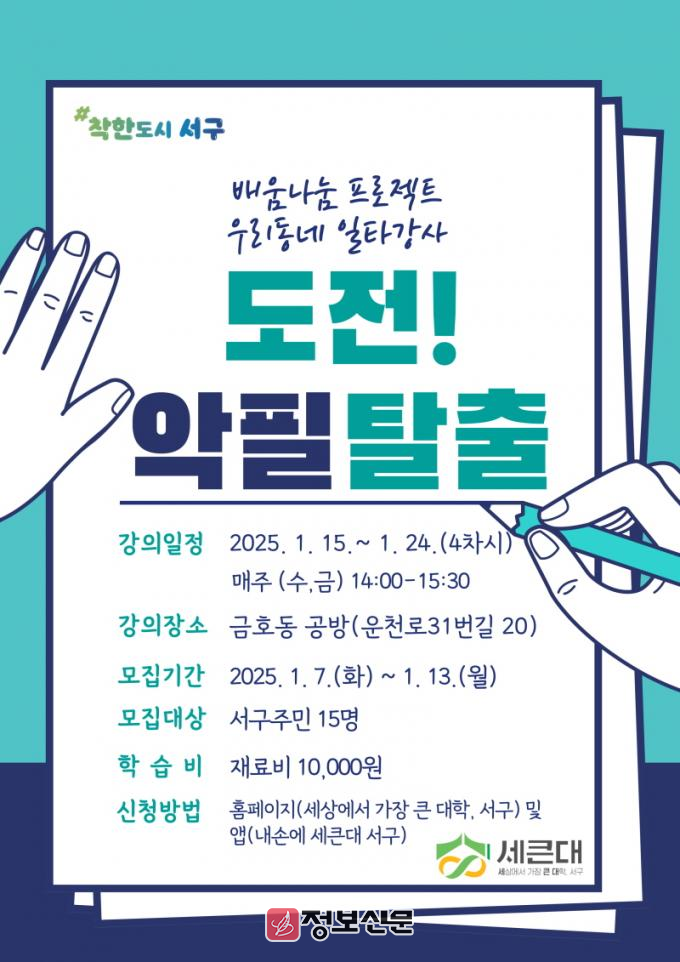 강좌는 오는 15일부터 24일까지 매주 수요일과 금요일 오후 2시에 열린다. 강의는 금호동에 위치한 글씨공방(운천로31번길 20)에서 진행되며, 서구 주민이라면 누구나 신청할 수 있다.