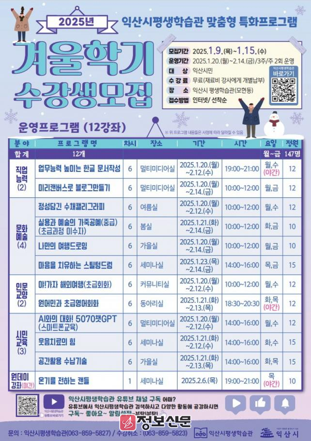 익산시평생학습관은 1월 20일부터 2월 14일까지 '겨울학기'를 운영한다. 시민 참여를 확대하고 다양한 분야의 자기계발 기회를 제공하고자 △직업능력 △문화예술 △인문교양 △시민교육 △원데이특강 등 5개 분야 12개 프로그램을 준비했다.
