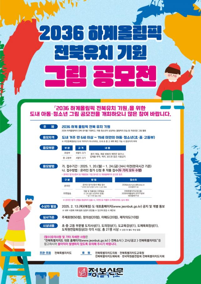 이정석 2036 하계올림픽 유치 TF 본부장은 “이번 공모전은 단순한 그림 대회를 넘어, 전북 미래세대의 꿈과 희망을 공유하고, 올림픽 유치에 대한 도민들의 관심과 지지를 끌어올리는 중요한 계기가 될 것”이라며, “도내 아동·청소년들이 창의적이고 의미 있는 작품으로 공모전에 적극 참여해 주길 바란다”고 말했다.