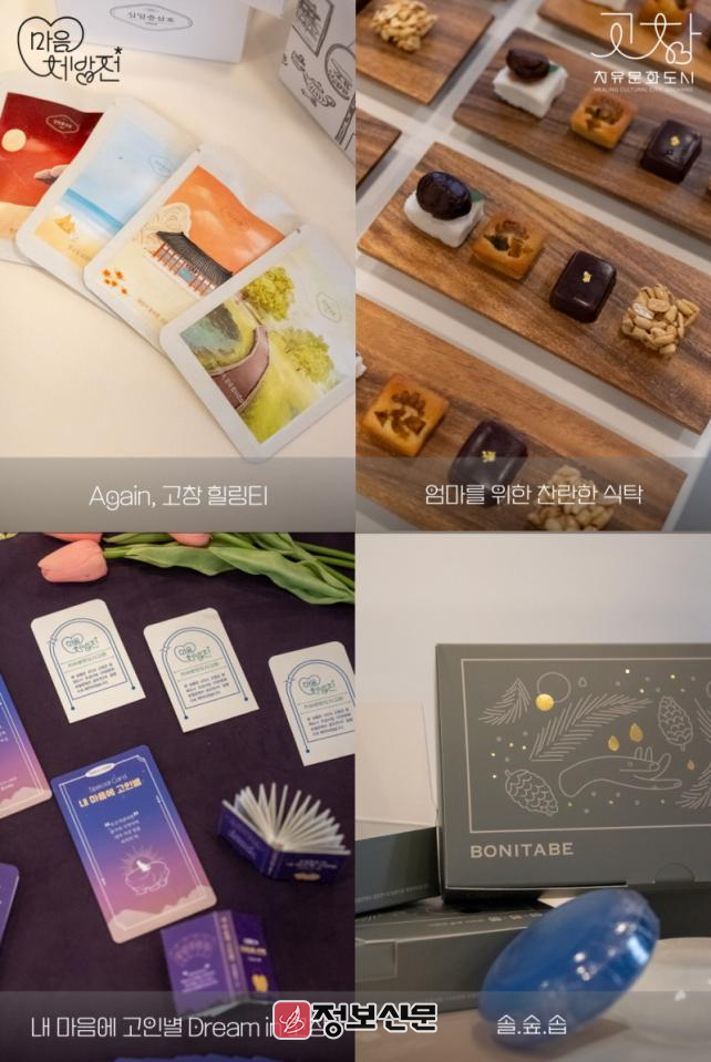 상품은 △고창 농산물 활용 차 △고창 고인돌을 활용한 긍정 확언 타로카드 △고창 솔향을 담은 비누 △고창 식재료를 활용한 육아치유 프로그램 총 4종으로 구성되어 있다. 일과 육아로 지친 청년들의 마음을 위로하는 내용을 담고 있다.