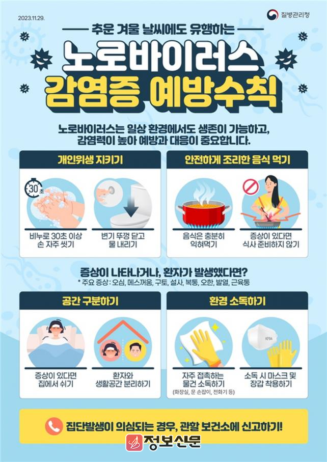 보건소 관계자는“최근 노로바이러스감염증 및 인플루엔자 발생이 증가하고 있어 마스크 착용 및 올바른 손씻기, 영유아 보육시설에서는 유증상자 등원 자제 등 예방수칙 준수와 증상이 있을 경우 필요한 진료를 받아 동절기 유행 감염병 예방에 만전을 기해줄 것을 당부드린다”하며 강조하였다.