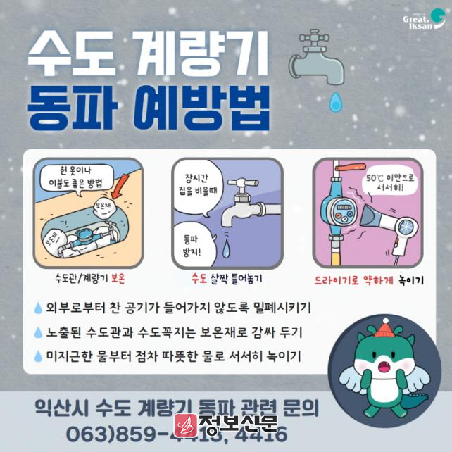 주요 요령을 보면 △계량기 함 보온재로 채우기 △한파 시 수도꼭지 약하게 열어두기 △계량기 동결 시 헤어드라이어를 사용하거나 미지근한 물부터 점차 따뜻한 물로 천천히 녹이기 등이 있다. 동파 시에는 상수도과(063-859-4413, 4416)로 신고하면 된다.