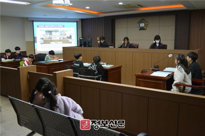 ![]() 순천청소년꿈키움센터가 지역아동센터 학생을 대상으로 모의법정 진로체험을 실시하는 모습 |