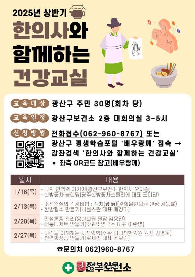 한의사와 함께하는 건강 교실은 오는 16일과 2월 13일, 20일, 27일에 열리며, 광산구보건소 2층 대회의실에서 오후 3시부터 5시까지 진행한다. 건강 교실에 대한 자세한 내용은 광산구 건강증진과(062-960-8767)로 문의하면 된다.