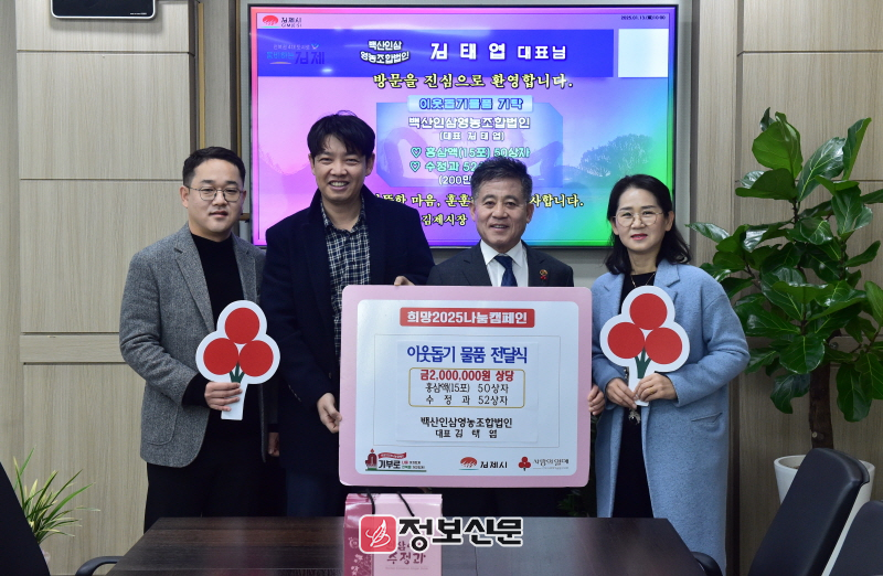 정성주 김제시장은“어려운 이웃을 위해 따뜻한 나눔을 실천해 준 백산인삼영농조합법인에 깊이 감사드리며, 기탁해 준 물품 관내 저소득층에 소중히 전달하겠다.”고 말했다.