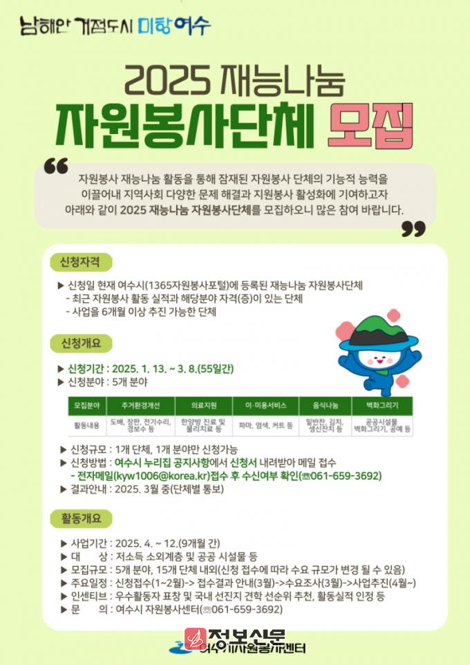 ![]() 여수시(시장 정기명)는 오는 3월 8일까지 ‘2025 찾아가는 재능나눔 프로그램’에 참여할 자원봉사 단체를 모집한다고 14일 밝혔다. |