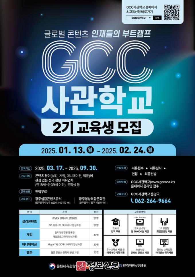 광주시는 GCC 사관학교 2기 교육생을 GCC사관학교 공식 누리집(https://www.gccaca.kr)을 통해 오는 2월24일까지 모집한다. 실감·게임·애니메이션·웹툰 등 콘텐츠 분야에 관심이 있는 만 18세에서 39세 사이의 전국 청년 미취업자(국내 거주 외국인 유학생 포함) 누구나 신청할 수 있다.