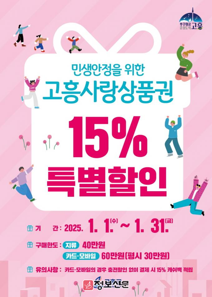 군은 다가오는 설 명절을 맞아 가계 부담을 덜고 경기침체로 어려움을 겪고 있는 소상공인을 지원하기 위해 1월 한 달간 ‘민생 안정 고흥사랑상품권 15% 특별할인’을 진행하고 있다.