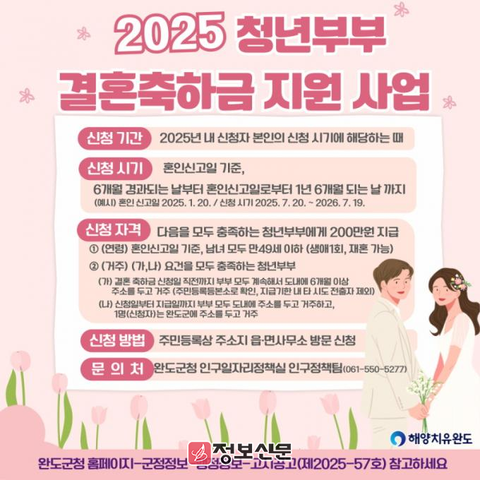 ![]() 완도군, 2025년 청년 부부 결혼축하금 지원사업 추진 |