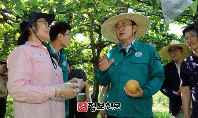 ![]() 나주시가 지난해 일소피해가 발생한 배 재배농가에 긴급 경영안전자금을 지원한다. 1ha당 100만원으로 2월 중 지역화폐로 지급할 예정이다. 윤병태 나주시장이 지난해 9월 일소피해 농가 현장을 방문해 농가주의 애로사항을 듣고 있다. (사진제공-나주시)