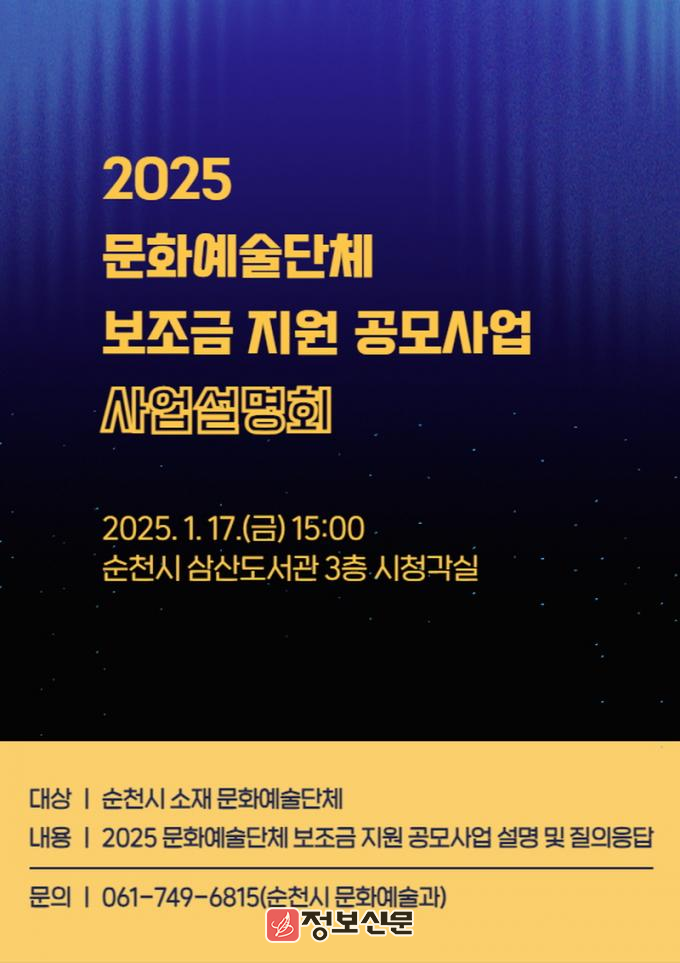 2025년 문화예술단체 보조금 지원사업 공모 신청 기간은 2월 5일까지이며, 지방보조금관리시스템(보탬e)에서 신청하면 된다. 사업설명회는 별도의 신청 절차 없이 당일 현장 등록 후 참여가 가능하며, 자세한 내용은 순천시 문화예술과(061-749-6815)로 문의하면 된다.
