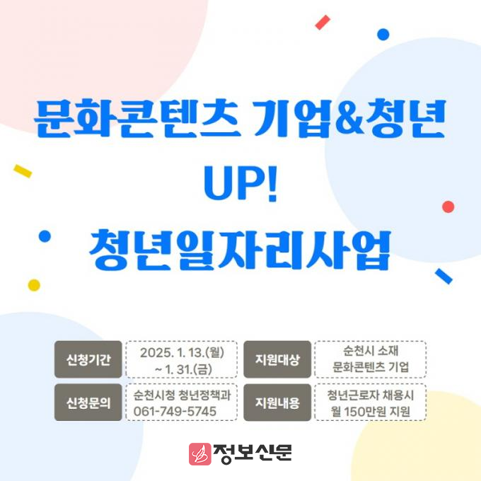 ![]() 순천시, ‘문화콘텐츠 기업&청년 UP! 청년일자리 지원사업’ 참여기업 모집 |