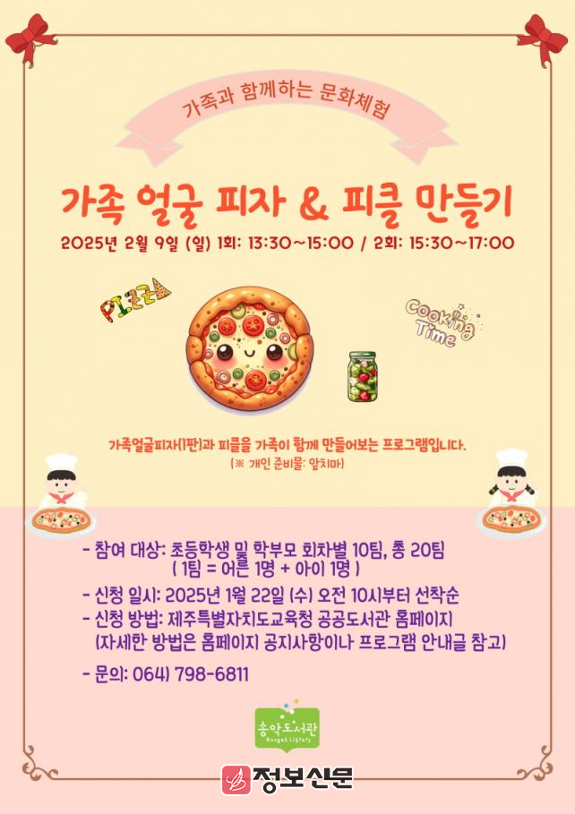 ![]() 송악도서관, 가족얼굴피자와 피클 만들기 20팀 참가자 모집 |