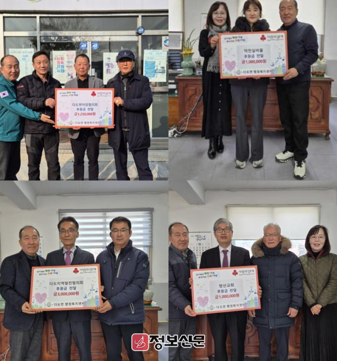 염행곤 다도면장은 “어려운 이웃을 향한 따뜻한 관심과 지원으로 나눔을 실천해 주신 모든 분들께 깊이 감사드린다”며 “소중한 성금이 꼭 필요한 곳에 전달되어 지역사회에 희망과 위로를 줄 수 있도록 최선을 다하겠다”고 전했다.