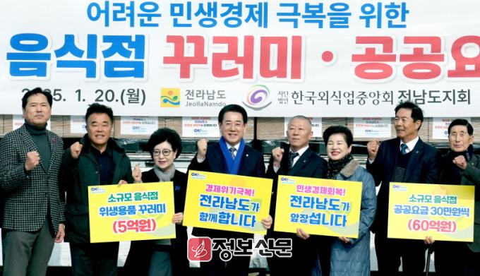 ![]() 김영록 전라남도지사가 20일 전남도청 만남의 광장에서 열린 ‘소규모 음식점 꾸러미·공공요금 지원’ 행사에서 참석자들과 경기침체 장기화로 어려운 음식점의 민생경기 조기 회복을 위한 퍼포먼스를 하고 있다. |