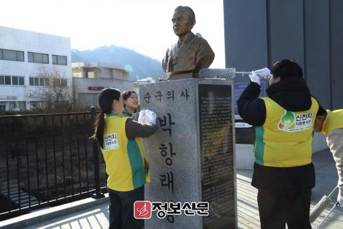 ![]() [사진 제공 = 신천지자원봉사단 순천지부]지난 19일 신천지자원봉사단 순천지부 봉사자들이 독립운동가 박항래 의사의 흉상을 청소하고 있다.