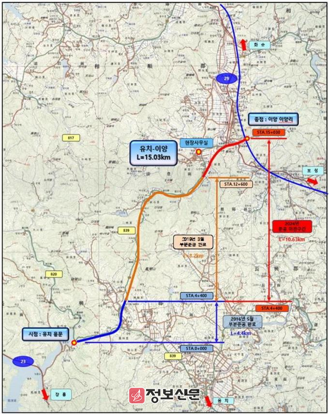 이번 임시 개통 구간은 화순 청풍 교차로에서 국도 29호선과 연결되는 야문 교차로까지 3.33㎞다. 최종 점검 후 정식 개통되면 기존 45분 이상 소요되던 이동 시간이 15분으로 단축돼 교통 안정성 확보 및 지역 주민의 정주 여건 향상이 기대된다.