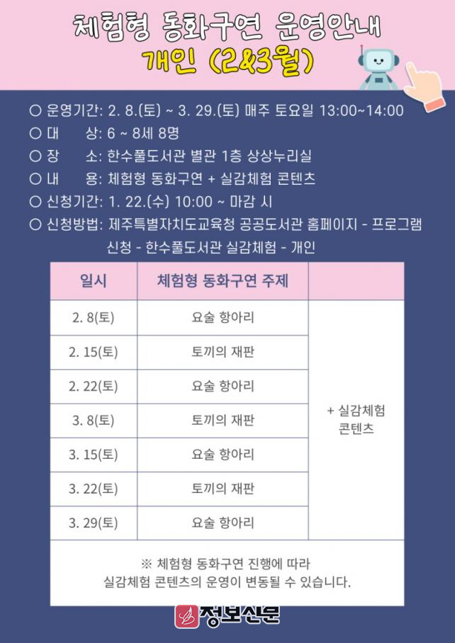 동화구연 신청은 오는 22일 오전 10시부터 마감 시까지 제주도교육청 공공도서관 누리집(https://org.jje.go.kr/lib/index.jje)을 통해 선착순으로 진행하며 오는 4월 이후 프로그램 운영은 추후 안내할 예정이다.