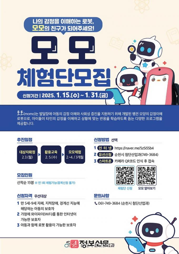 ![]() 순천시, 감정이해로봇 ‘모모’ 체험단 모집 |