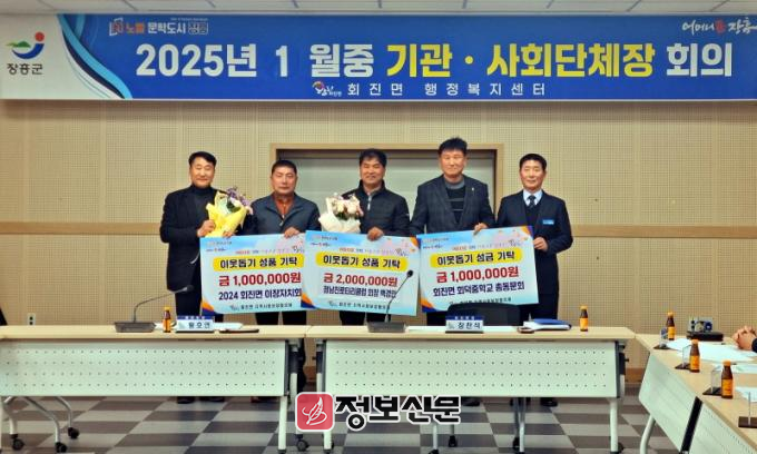 2024년 회진면 이장자치회(회장 백용제)에서 1백만 원, 2025년 정남진 로타리 클럽 백경만 회장이 2백만 원, 회덕중학교 총동문회에서 2백만 원을 지역의 어려운 이웃과 소외계층을 돕고자 쾌척했다.