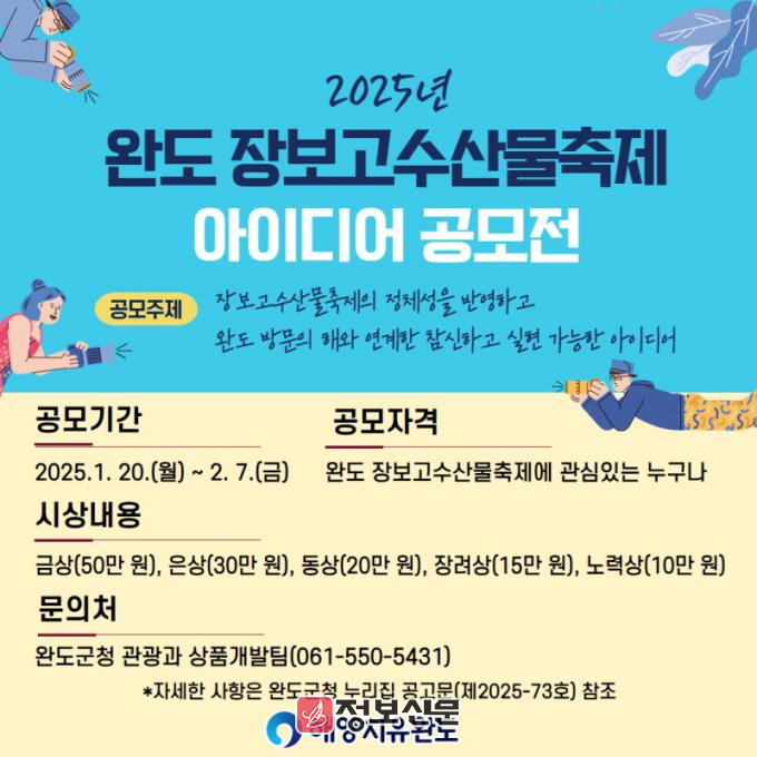오현철 관광과장은 “공모전을 통해 장보고수산물축제에 대한 관심이 높아지고 축제의 경쟁력을 강화할 수 있는 아이디어가 많이 발굴되길 기대한다”라고 전했다.