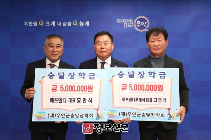 ![]() 에프엔디 홍만석·에프엔디후레쉬 고영석 대표, 무안군 승달장학금 각각 500만원 기탁 |