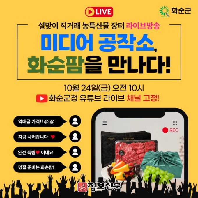 이번 라이브 방송은 직거래 장터에 참여하는 16개 업체의 판매 상품을 화순군청 유튜브 채널을 통해 실시간 방송으로 홍보하며, 화순팜 홈페이지를 통해 시청자들이 직접 상품을 구매할 수 있도록 진행될 예정이다.