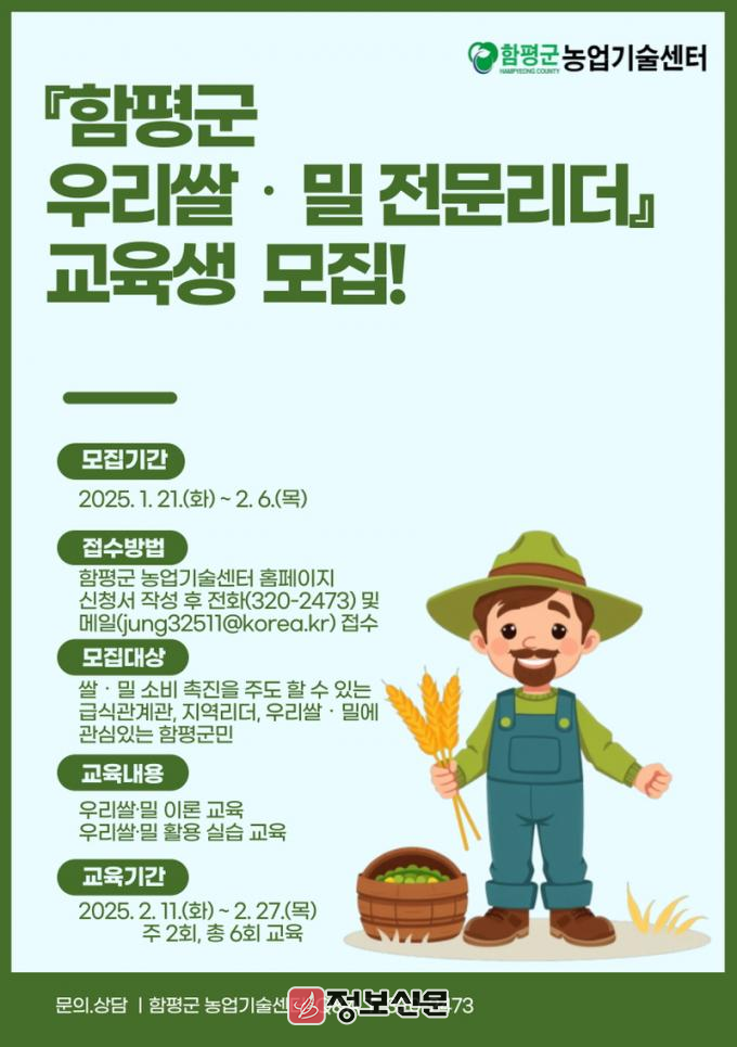 ![]() 함평군, 우리쌀.밀 전문리더 교육생 모집 |