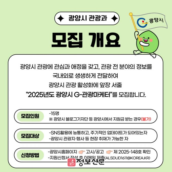 발대식은 2월 중 진행되며 제2기 G-관광마케터를 본격적으로 운영하는 시기는 오는 3월부터다. 모집, 평가, 활동비 지원과 관련해 자세한 내용은 광양시청 누리집(홈페이지) 공고란(‘2025년도 제2기 G-관광마케터 모집 공고’)에서 확인할 수 있다.