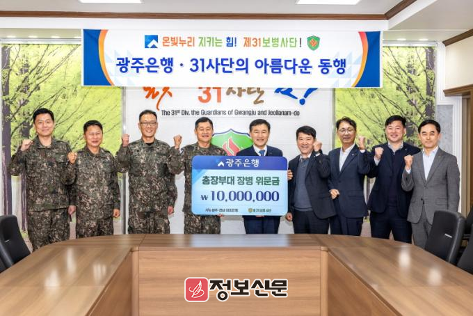 광주은행은 명절을 앞두고 지역 방호와 대민지원 등 맡은 바 임무에 최선을 다하는 군 장병들을 격려하기 위해 매년 방문하고 있으며, 지역민의 안전을 위해 힘쓰고 있는 제31보병사단에 위문금을 전달하며 감사함을 표했다.