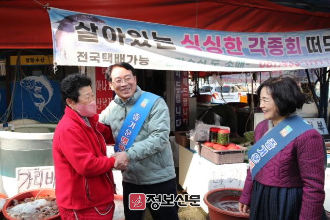 이날 김동수 강진읍 자율상권 협동조합장 등과 함께 어깨띠를 두르고 상가 약 100개소를 방문해 일일이 상인들과 소통하며 따뜻한 명절 인사를 주고받았다.