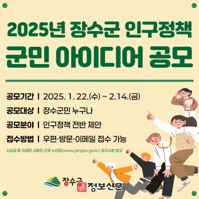 ![]() 장수군, 2025년 인구정책 군민 아이디어 공모전 개최 |