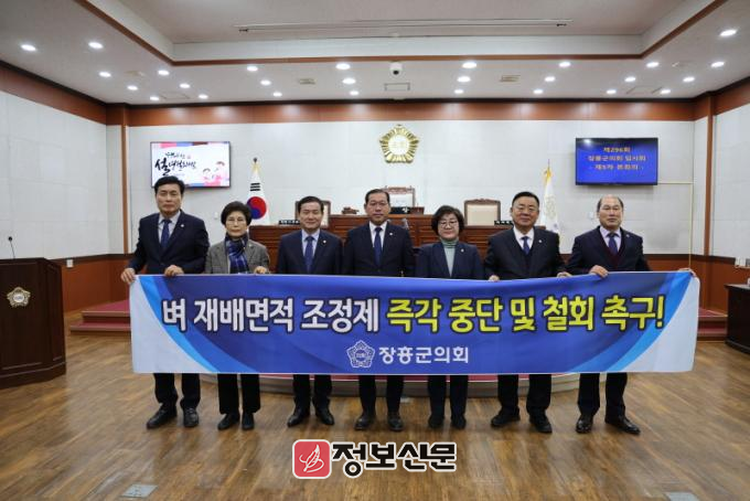 ![]() 장흥군의회, 김기용 의원 대표발의 벼 재배면적 조정제 철회 촉구 건의안 원안 가결 |