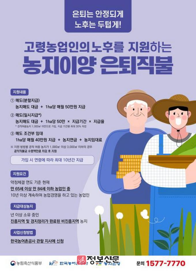 농지이양은퇴직불사업은 고령농업인(만 65~84세)이 농지를 매도하고 농업은퇴를 할 때 매월 일정 금액의 직불금을 지급하는 사업이다. 고령 농업인이 이양한 농지는 청년농업인에 우선적으로 제공해 농업 생산성 향상과 미래농업 준비를 위해 활용토록 지원할 계획이다.