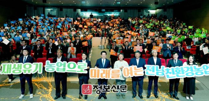 ![]() 전라남도가 전국 최대 친환경농산물 생산·공급기지로서 경쟁력 제고를 위해 올해 1천628억 원을 들여 유기농 중심의 저탄소 친환경농업을 집중 육성한다. 김영록 전라남도지사가 지난해 7월 5일 도청 김대중강당에서 열린 ‘2024년 전남 친환경 미래농업 비전 선포식’에서 ‘저탄소·미래농업’ 비전 선포 퍼포먼스를 하는 모습