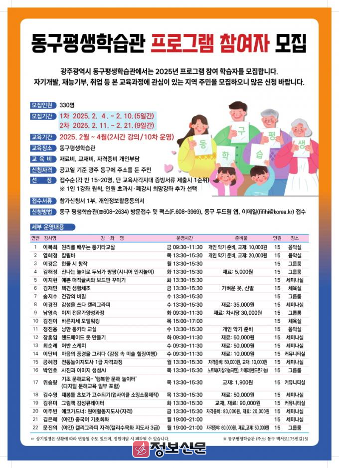 ![]() 광주시 동구, ‘배움으로 행복한 일상’ 동구평생학습관 학습자 모집 |
