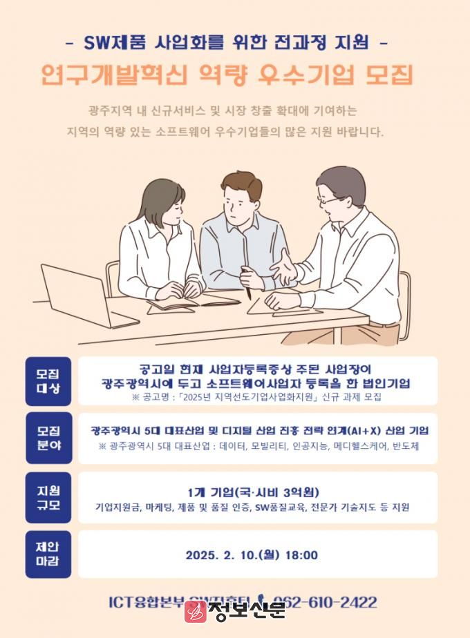 ![]() 광주광역시, SW기업 제품 사업화 지원기업 모집 |
