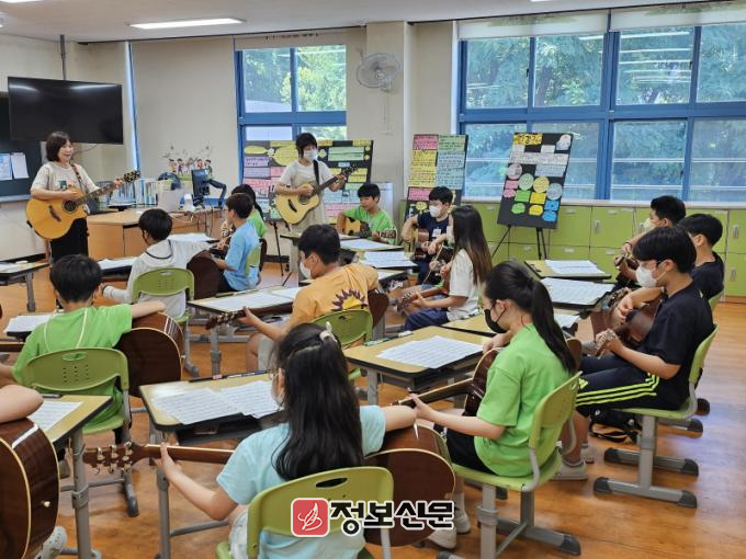 ‘통기타 행복교실’은 2019년 4개교 6학급 97명을 대상으로 시범운영을 시작해 지난해 10개교 28학급 576명이 참여하며 그 규모가 확장하고 있다. 동구만의 차별화 된 교육지원 사업으로 모든 학생들에게 악기배움의 기회를 제공함으로써 보편적 교육복지 여건 조성에 크게 이바지하고 있다.