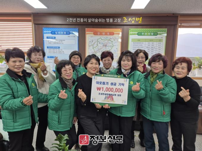 보성군 조성면은 지난 20일에는 조성면 청년 모임인‘조성면아싸리회(회장 임상원)’가 50만원을 기탁했다고 밝혔다. 같은 날 ‘조성면새마을부녀회(회장 신주아)’도 이웃돕기 성금 100만원을 기탁했다.