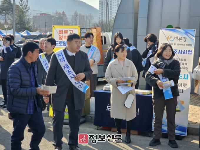 이번 홍보에서는 주민들의 재산권 행사·보호 및 일상생활과 밀접한 관련이 있는 지적재조사사업과 도로명주소에 대하여 보다 많은 사람이 쉽게 이해하고 접할 수 있도록 다양한 홍보 물품을 나눠줬다.