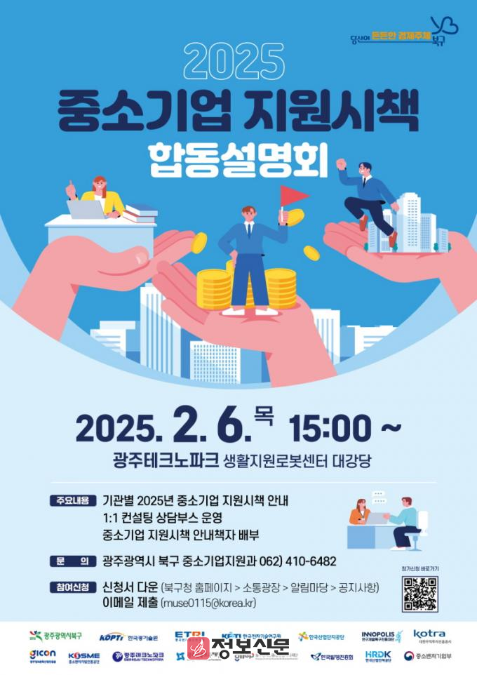 또한 이번 간담회에는 북구를 비롯한 중소벤처기업진흥공단, KOTRA, 한국산업단지공단, 광주신용보증재단, 광주테크노파크 등 총 17개 기관이 참여하여 자금 지원, 수출 촉진, 기술 고도화, 지식재산권 보호 등 중소기업의 경영 지원을 위한 총 93개의 주요 시책을 설명할 예정이다.
